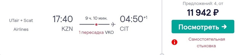 Выбирая с какой авиакомпанией путешествовать, всегда расставляю приоритеты, что мне важнее всего: максимально низкая стоимость билетов или же время в дороге. В данном случае такими вопросами мне задаваться не нужно, потому что по двум этим параметрам идеально подходит совместный авиарейс «ЮТэйр» и Scat Airlines. Время в пути — 9 ч., а билет можно найти за 1,5 месяца до рейса всего за 12000 рублей. Когда у того же «Аэрофлота» время на дорогу с пересадкой в Москве примерно такое же, а билеты примерно на 35% дороже. Единственный момент — приходится подстраиваться под расписание перевозчиков, потому что такой вариант перелета доступен только два раза в неделю.