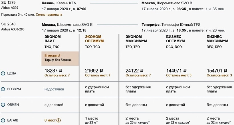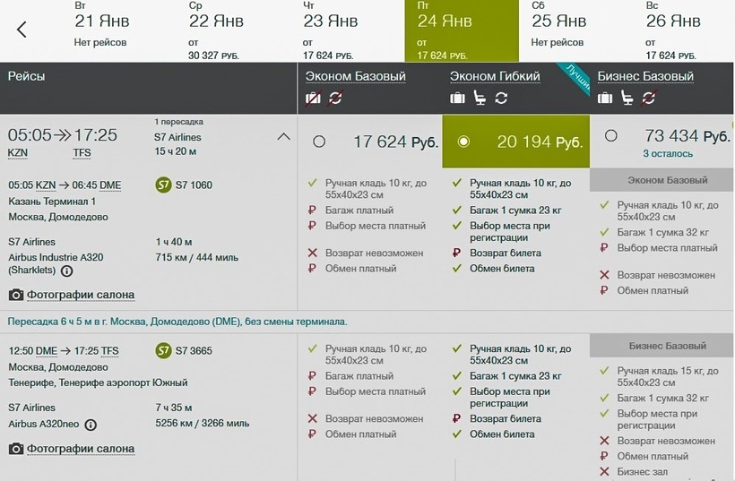 В зимне-весенний период авиабилеты только туда у компании немного дешевле, чем у «Аэрофлота» — с багажом обойдутся от 20000 ₽. Путешествие туда-обратно с S7 получается дороже, чем с предыдущим перевозчиком — будет стоить от 34000 ₽. Кроме того, преодолеть весь маршрут в бизнес-классе с S7 нельзя — из Казани в Москву оператор предлагает авиаперелет только в классе эконом.