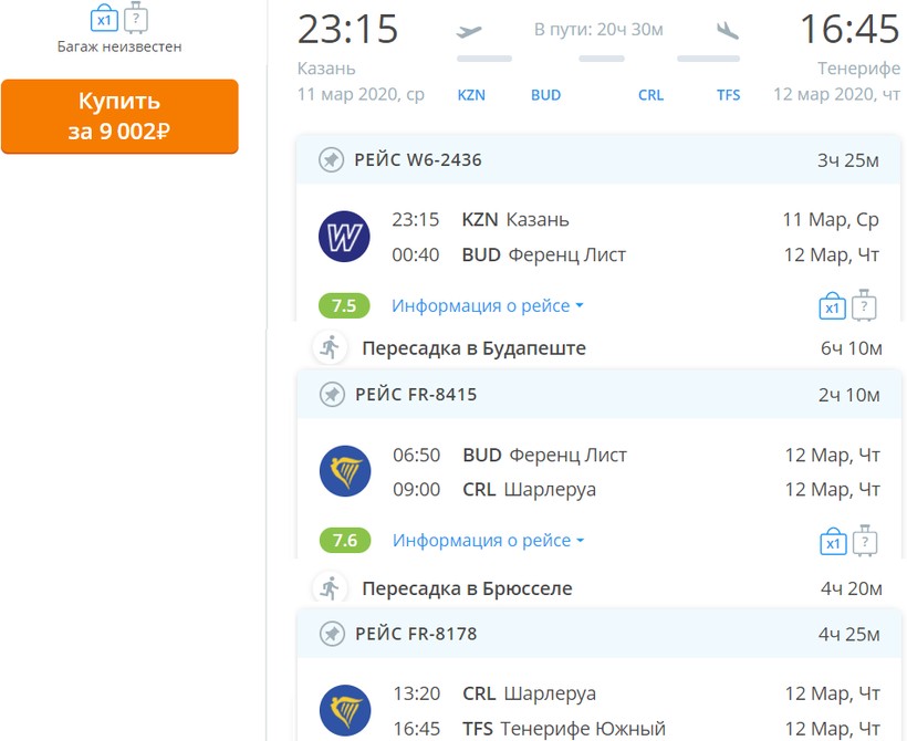 Если скорость преодоления пути не играет существенной роли, могу рекомендовать авиаперелет с лоукостерами с двумя пересадками. Например, долететь до Тенерифе можно с компаниями Wizz Air и Ryanair через Будапешт и Брюссель (пересадки займут 6 ч. и 4,5 ч. соответственно). Все авиапутешествие продлится 20,5 часа, билет с ручной кладью можно купить за 9000 ₽ (в одну сторону).