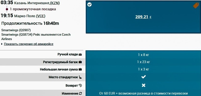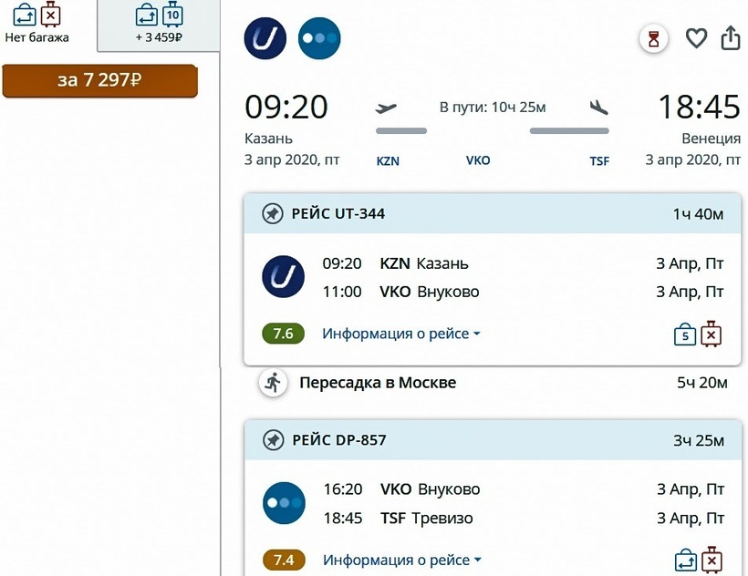 Кроме описанных вариантов полетов, преодолеть маршрут получится авиарейсами с самостоятельной стыковкой (во время пересадки придется забирать багаж и заново проходить регистрацию). Например, долететь до Венеции можно с Utair и «Победой» через Внуково. Со стыковкой в 5,5 ч. полет займет 10,5 ч. и обойдется только туда с ручной кладью всего от 7500 ₽ (с багажом — от 11500 ₽). Стоимость действуют при покупке за 4 месяца до вылета.