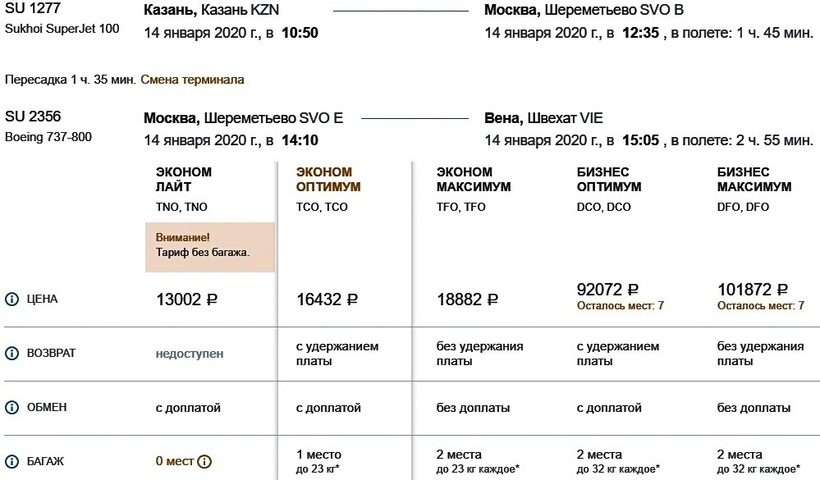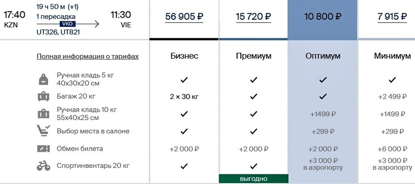 Для полета по направлению с «Аэрофлотом» я выбираю тариф «Оптимум», потому что он включает багаж. Только туда перелет обойдется от 16500 ₽, если забронировать билет сразу и в обратную сторону — от 25000 ₽. Путешествие в бизнес-классе оператор предлагает по цене от 92000 ₽.