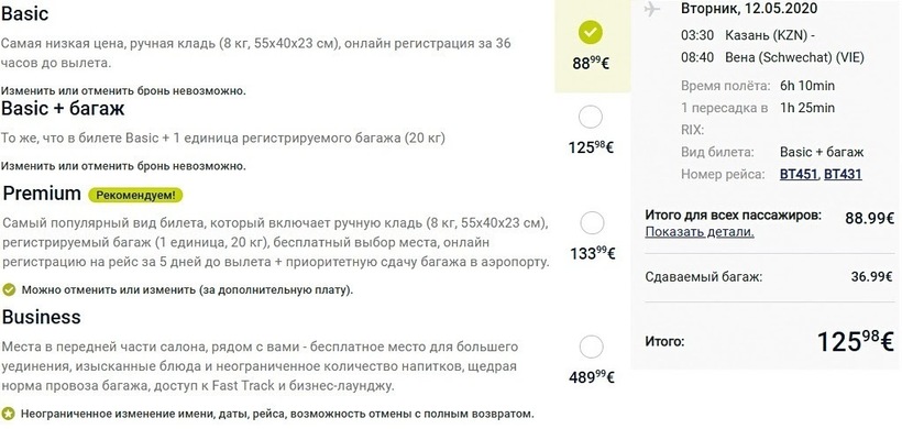 Преодолеть маршрут с этим латвийским перевозчиком можно с конца апреля до середины октября дважды в неделю (по вторникам и пятницам). Полет будет быстрым — с полуторачасовой стыковкой в Риге займет всего 6 часов. Авиарейс утренний. Кроме скорости перелета, важная причина, почему я могу рекомендовать этого перевозчика — дешевые билеты. Авиапутешествие с багажом только туда обойдется от 8800 ₽ (с ручной кладью — от 7000 ₽), в обе стороны — от 17000 ₽. Бизнес-класс — от 34000 ₽.