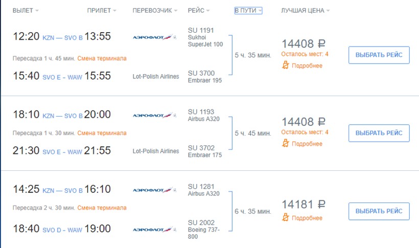Стоимость путешествия составляет 14000 рублей (без багажа). Если хотите взять с собой много вещей, то лучше купить тариф «Эконом Оптимум», он дороже на 3000 рублей, зато в качестве бонуса идет опция выбора места на борту лайнера. Давно заметила, что у «Аэрофлота» выгоднее оплачивать перелет сразу туда и в обратном направлении, чем покупать два отдельных билета. Смотрите сами: поездка по маршруту Казань — Варшава — Казань будет стоить 21000 рублей. Динамического ценообразования у перевозчика нет, так что не буду рекомендовать платить за поездку заранее, но лучше взять авиабилеты хотя бы за недельку, чтобы точно были места.