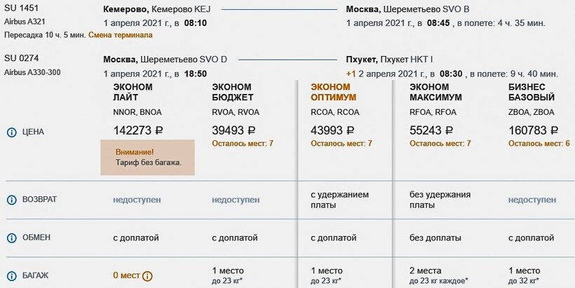 Из российского Кемерова на знаменитый тайский остров регулярные прямые рейсы не выполняются. Но преодолеть путь напрямую можно чартерами (расскажу далее). Регулярное транзитное авиасообщение также не могу назвать хорошо развитым, потому что перелеты с одной пересадкой по маршруту совершает лишь «Аэрофлот». С октября по середину мая российский оператор выполняет ежедневные авиарейсы, а в летнее время преодолеть путь можно только по средам, пятницам и субботам. Путешествие с «Аэрофлотом» получается довольно длительным, так как оно включает десятичасовую пересадку в Москве. Весь полет занимает 24,5 ч. Плюс в том, что стыковка дневная, поэтому можно погулять по российской столице и увидеть, например, Красную площадь и Кремль, купить что-нибудь в ГУМе или побывать на Воробьевых горах. Билеты у компании не самые дешевые: в одну сторону стоят от 39500 ₽, туда-обратно — от 65000 ₽. В эти минимальные цены включен багаж, а покупать авиабилеты по тарифу с ручной кладью не советую, так как их стоимость выше более чем в 3 раза. Бизнес-класс — от 161000 ₽. У данного российского перевозчика рекомендую бронировать перелет заранее на вылеты перед новогодними и майскими праздниками, а также на июль и август, так как в эти периоды цены увеличиваются на 10000 ₽.