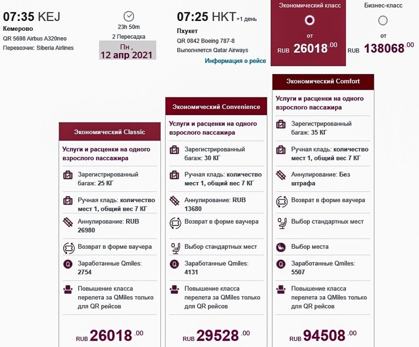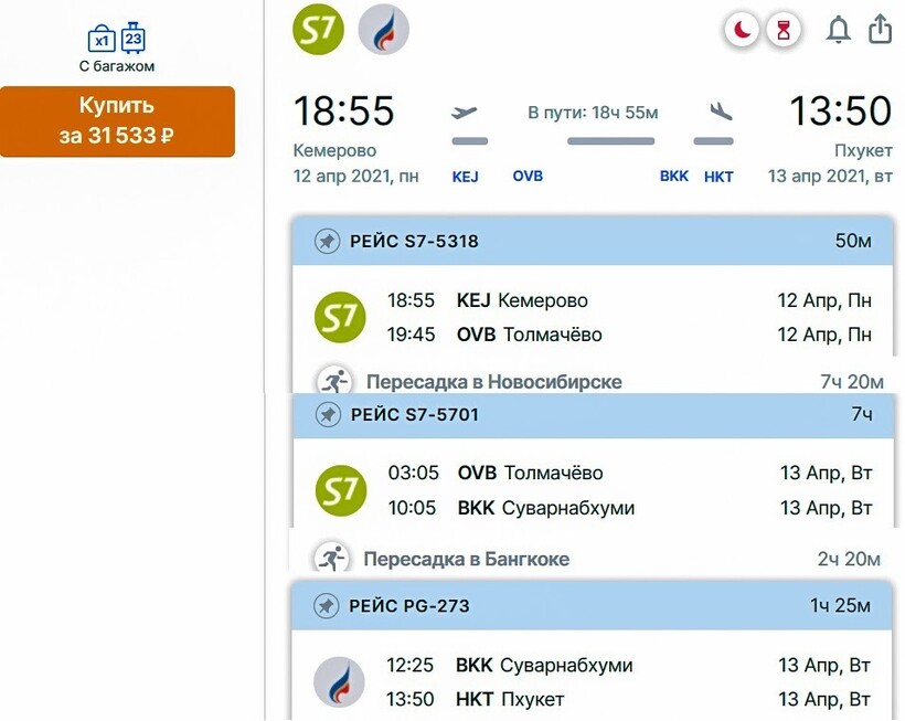 С S7 и Bangkok Airways могу рекомендовать летать по маршруту по понедельникам, когда с пересадкой в Новосибирске в 7,5 ч. и Бангкоке в 2,5 ч. путешествие занимает 19 ч. В другие дни недели полет длится более 40 часов, что нецелесообразно. Авиабилеты у данных компаний можно назвать недорогими: туда стоят от 31500 ₽, если купить и на обратный путь — от 53000 ₽. Удешевить авиаперелет за счет багажа нельзя, так как его провоз уже включен в минимальные цены. Бизнес-класс по маршруту не предлагается.
