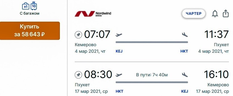 Кроме регулярных стыковочных авиарейсов, попасть на тайский остров можно и напрямую чартерами компании Nordwind Airlines. К минусам данного авиаоператора отнесу не самое удобное расписание полетов, ведь самолеты летают только 1 раз в 14 дней. Зато путешествие занимает всего 7,5 часа. Покупать билеты на чартер в одну сторону не советую, так как они будут дорогими — обойдутся от 68000 ₽. Выгоднее бронировать авиаперелет сразу туда-обратно, это будет стоить от 58500 ₽. В стоимость включен провоз 10 кг багажа. Бизнес-класс чартерный перевозчик не предлагает.