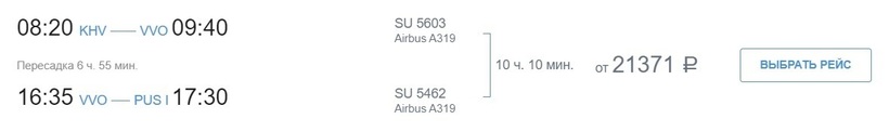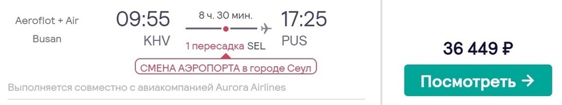 Есть и более быстрый способ попасть в Пусан. Можно добраться за 8,5 ч. Правда этот вариант менее популярный, потому что требует смены воздушной гавани в Сеуле. Самолет авиакомпании «Аврора» доставит в аэропорт Инчхон. Следующий вылет с Air Busan из авиаузла Джимпо. На стыковку отводится 5 часов. Авиабилеты — от 36400 рублей (за месяц и более).