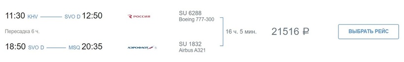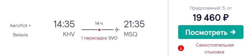 Прямые рейсы из Хабаровска в столицу Беларуси не предлагает ни один авиаоператор. Чтобы попасть в Минск, нужно сделать минимум одну пересадку. Стоимость билетов по маршруту Хабаровск — Москва — Минск у самой крупной российской а/к «Аэрофлот» составляет 21500 рублей. Причем за такую цену билеты можно купить даже за неделю до отправления лайнера. Накануне отправления или в праздничные дни из-за высокого спроса цена на билеты может быть выше в два раза. Также я избегаю путешествий в субботу и воскресенье, потому что билеты в эти дни, как правило, дороже на 10–15%. Некоторые рейсы по этому маршруту выполняются совместно с «Россией» (дочерняя а/к «Аэрофлота»).