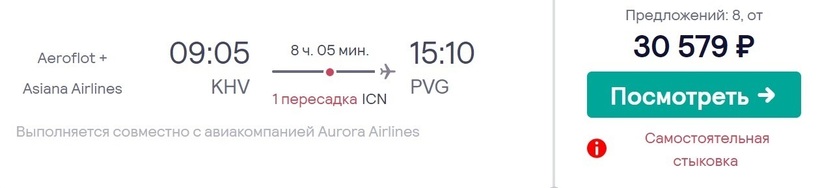 В Шанхай из Хабаровска прямые самолеты не летают, добираюсь рейсами со стыковкой. Один из самых быстрых вариантов — совершить авиапутешествие с «Аэрофлотом» (совместно с Aurora Airlines) и Asiana Airlines. Общее время в пути — 6,5–8 часов (в зависимости от дня недели). Билет накануне вылета можно купить за 52,5 тысячи. Если бронировать за 2,5 месяца до поездки, то его стоимость будет 30500 рублей. Так что, приобретая авиабилет заранее, можно сэкономить более 20000 рублей.