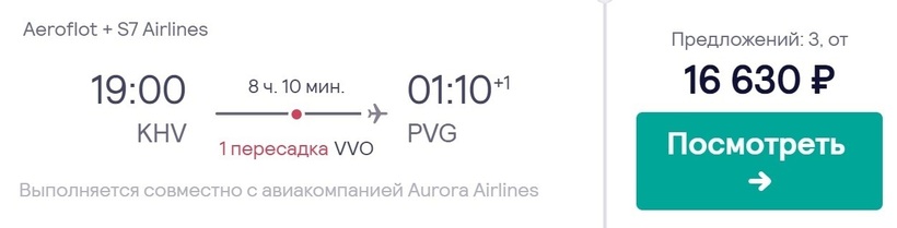 Стыковка в аэропорту Владивостока (Кневичи) — 3,5 ч. В воздушной гавани есть все для комфортного ожидания следующего рейса — магазины, кафе и закусочные, ВИП-залы. Два раза в неделю до Шанхая можно долететь через Владивосток с а/к S7, потратив на дорогу 7 часов. При этом а/к предлагает вполне дешевые авиабилеты на этот перелет — от 11400 рублей.