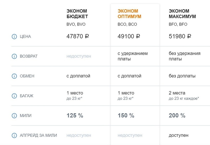 «Бюджет». Самый дешевый. Его разбирают быстрее всего. Включена и ручная кладь, и багаж. Билет невозвратный, выбор места платный.