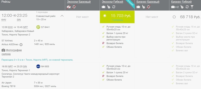 Более бюджетный и быстрый вариант перелета предлагают S7 и Air Japan. Общее время в пути — 13,5 часа. Стыковка в аэропорту Токио — Нарита занимает 3 часа. Билет (за месяц до рейса) только туда — от 15700 рублей. Обратный обойдется примерно в такую же сумму. Тариф экономкласса называется «Гибкий». По его условиям на борт лайнера можно взять и ручную кладь, и багаж. Обмен билета — бесплатная опция. Возврат — только со штрафом. Также есть и бизнес-класс, для тех, кто привык путешествовать с максимальным комфортом. Билеты — от 68700 рублей (за месяц). Вернуть или обменять авиабилет по этому тарифу можно совершенно бесплатно.