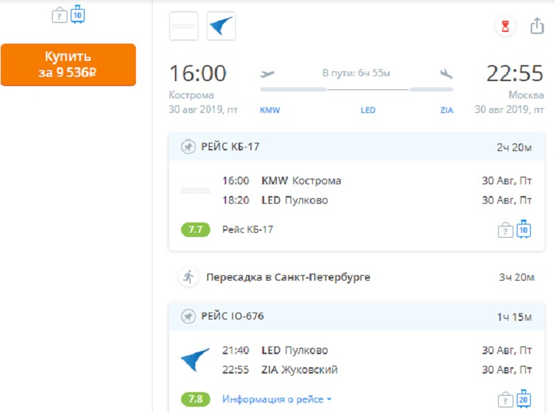 Лучшие варианты стыковочных авиарейсов с минимальными пересадками в Петербурге (от 2,5 часа) предлагает «Костромское авиапредприятие» (единственная авиакомпания, выполняющая полеты из Костромы) совместно с «Уральскими авиалиниями», «ИрАэро», «Ямалом», «Аэрофлотом» или «Победой» (в зависимости от дня недели). Полет займет от 7 часов, и авиабилеты в экономклассе только туда на ближайшие даты обойдутся от 9500 рублей (с багажом), в обе стороны — от 17500 ₽.