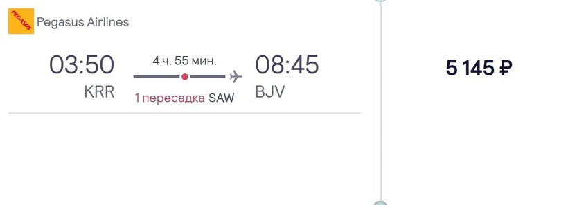 Более дешевый и быстрый вариант предлагает турецкий лоукостер Pegasus Airlines. Время в пути — 5 часов. Стыковка в Стамбуле — 1,5 ч. (аэропорт Сабиха Гекчен). Билеты за 1,5 месяца до вылета можно купить минимум за 5100 рублей.