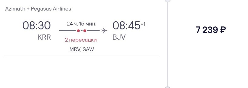 Вполне реально найти билеты по приемлемым ценам на рейсы с двумя пересадками. Например, можете рассмотреть вариант авиаперелета с а/к «Азимут» и Pegasus Airlines. Дорога до места назначения займет сутки. На пересадки в Минеральных Водах и Стамбуле уйдет около 20 ч. Проездные документы за месяц стоят от 7200 рублей.