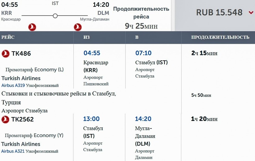 Билеты у «Турецких авиалиний» в одну сторону обойдутся от 15500 ₽, если бронировать и в обратную — от 24000 ₽. Бизнес-класс — от 61000 ₽.