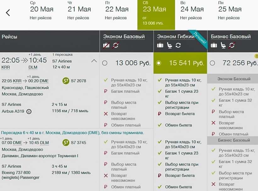 Компания осуществляет авиарейсы с мая по конец октября. В мае самолеты летают только по субботам, в остальные месяцы — еще и по вторникам. С пересадкой в Домодедово почти в 7 ч. полет займет около 13 ч. Недостаток такого варианта путешествия — ночная стыковка в Москве (придется дополнительно потратиться на гостиницу). Стоимость полета с S7 сопоставима с ценами «Турецких авиалиний» — билеты только туда с багажом обойдутся от 15500 ₽. Авиаперелет в обе стороны будет стоить от 28000 ₽. Бизнес-класс оператор предлагает только на отрезке маршрута Москва — Даламан, а до российской столицы придется лететь в классе эконом. Такой вариант путешествия обойдется от 57500 ₽.