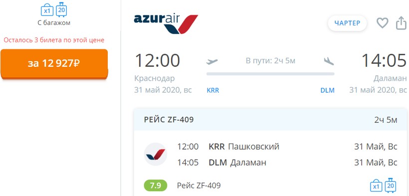 | Azur Air (ZF 409) Boeing 757-200 | 10:30 Краснодар (KRR) | 2 ч. 25 мин | 12:55 Даламан (DLM) | 2, 9, 16, 30 мая, 6, 20, 27 июня, 11, 18 июля, 1, 8, 22, 29 августа, 12, 19 сентября, 3, 10, 17, 24, 31 октября |