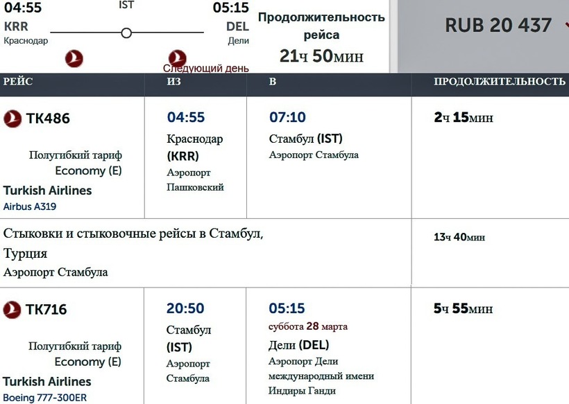 По соотношению стоимости и времени в пути оптимальный вариант авиаперелета предлагает «Аэрофлот», путешествие с которым будет максимально быстрым и относительно недорогим. Я же предпочла совместить полет в Дели с осмотром Стамбула, поэтому выбрала рейс Turkish Airlines. На авиабилетах туда-обратно мне удалось сэкономить 3500 ₽, по сравнению с российским перевозчиком, и 8000 ₽, по сравнению с лоукостером. Полет с flydubai рекомендую только в исключительных случаях, потому что он дороже, чем с двумя другими авиакомпаниями, и занимает больше времени. Любителям бизнес-класса советую лететь с «Аэрофлотом» — хотя билеты дороже на 9000 ₽, чем у Turkish Airlines, зато путешествие продлится на 10 часов меньше.