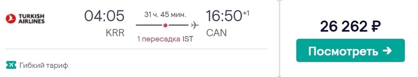 Перелет с Turkish Airlines подойдет тем путешественникам, которые по дороге в Гуанчжоу не против провести некоторое время в Стамбуле. Стыковка в этом городе займет немногим более 19 часов. За это время можно, например, съездить на Египетский базар, прокатиться по живописному Босфору или сходить во дворец-музей Топкапы. Времени на это будет достаточно. Также можно съездить и на бесплатную обзорную экскурсию по городу, которую организовывает Turkish Airlines для пассажиров, у которых стыковка в Стамбуле длится более 6 часов. Общее время в пути — сутки и восемь часов, удобно, что прибытие утром. Стоимость транзитного перелета составляет минимум 26200 рублей (за 2,5 месяца).