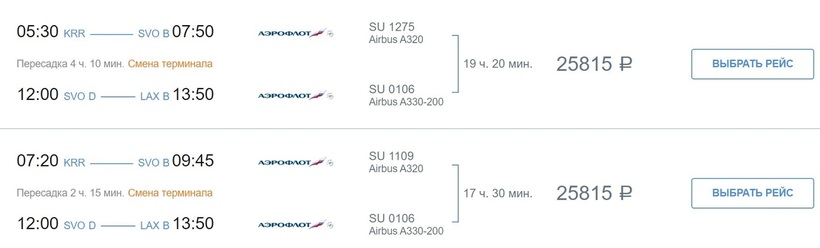 Бесспорно, оптимальнее всего путешествовать с одной а/к и с одной стыковкой. Именно поэтому мой выбор чаще всего падает на «Аэрофлот». Тем более, что у перевозчика вполне удобное расписание. Можно вылететь из Краснодара утром и через 17,5 часа быть в Лос-Анджелесе (в обед по местному времени). Стыковка в Шереметьево в этом случае длится всего 2 ч. Это максимально быстрый и самый удобный вариант перелета.