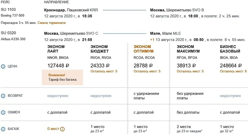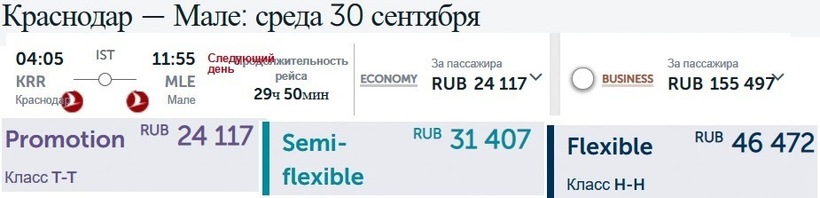 Учитывая большое расстояние между Краснодаром и столицей Мальдив, найти очень дешевые авиабилеты по направлению не удастся. Из описанных авиакомпаний недорогие варианты полетов только туда предлагают Turkish Airlines и «Аэрофлот». Авиабилеты туда-обратно у турецкого оператора дешевле на 4500 ₽, чем у российского, но, напомню, путешествие с первым перевозчиком занимает на 16–16,5 ч. больше времени. Я летала по маршруту с flydubai и Emirates. Несмотря на то, что цена билетов в обе стороны у этих компаний была выше аэрофлотовской на 4500 ₽, зато, во-первых, норма багажа у эмиратских операторов выше на 7 кг, во-вторых, мне удалось сэкономить 2–3,5 ч. времени. Самый недорогой бизнес-класс предлагают «Турецкие авиалинии».