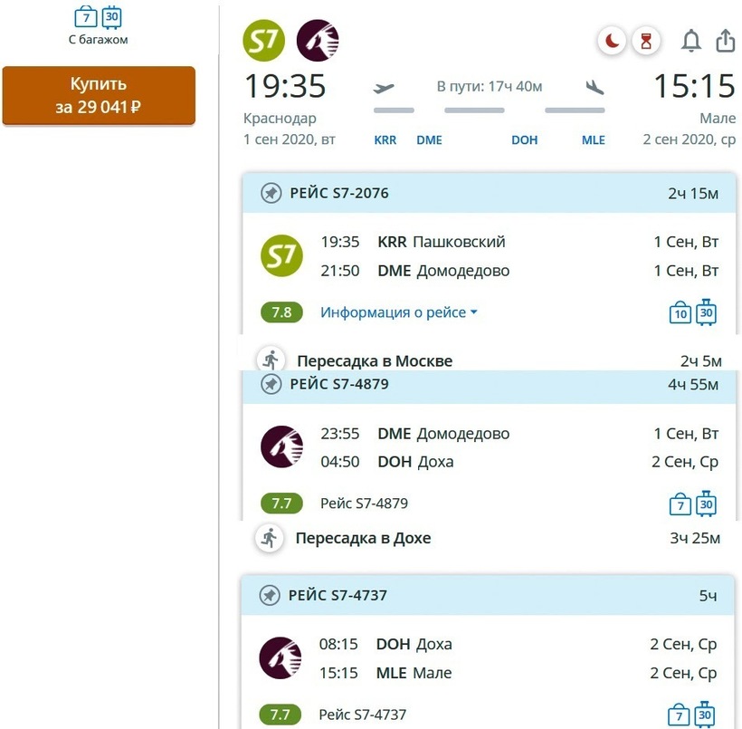 В исключительных случаях, кроме рейсов с одной пересадкой, могу рекомендовать авиаперелет с двумя стыковками с компаниями S7 Airlines и Qatar. Одно из преимуществ данных операторов в том, что вылететь с ними по маршруту можно каждый день. С пересадками в 2 ч. в Москве и 3,5 ч. в Дохе авиапутешествие займет 17,5 ч. Полет в одну сторону с багажом (до 30 кг) стоит от 29000 ₽ (при оформлении за 1,5 месяца до вылета), туда-обратно обойдется от 55500 ₽. На ближайшие даты билеты дороже примерно на 40000 ₽. Бизнес-класс (доступен только на отрезке пути от российской до мальдивской столицы) — от 185000 ₽. Перед новогодними праздниками цены увеличиваются на 5000–30000 ₽.