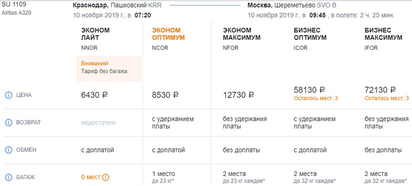 Аэрофлот (SU 1257) Airbus A320 | 18:45 Краснодар (KRR) | 3 ч. 45 мин | 22:30 Москва (SVO) | 11, 18, 25 октября |
