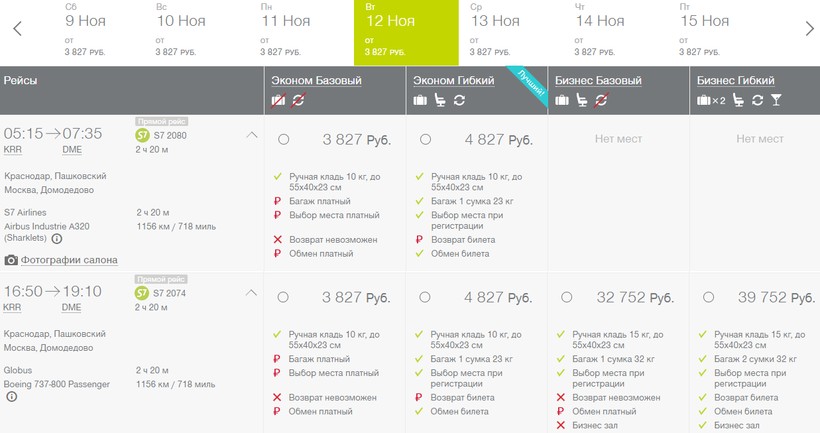 S7 Airlines (S7 2072) Boeing 737-800 | 16:05 Краснодар (KRR) | 3 ч. 45 мин | 19:50 Москва (DME) | 13, 14, 30 ноября, 1, 7, 8 декабря |