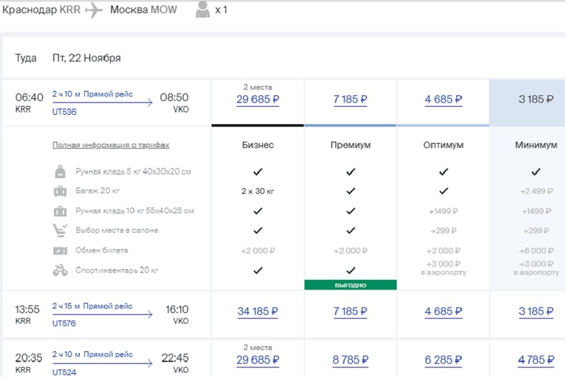 ЮТэйр (UT 576) Boeing 737-800 | 15:10 Краснодар (KRR) | 3 ч. 55 мин | 19:05 Москва (VKO) | 26, 27, 28, 29, 30, 31 октября, 1, 3, 5, 6, 7, 8, 10, 11, 12, 13, 14, 15, 16, 17 ноября, … |