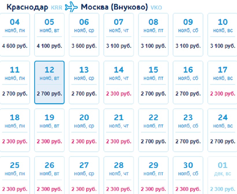 Билеты «туда-обратно» в ноябре обойдутся вам всего в 13 410 рублей, а в сентябре придется заплатить за них не менее 22 874 рубля. В среднем же, долететь до Москвы и вернуться в Краснодар можно за 17 584 рубля.