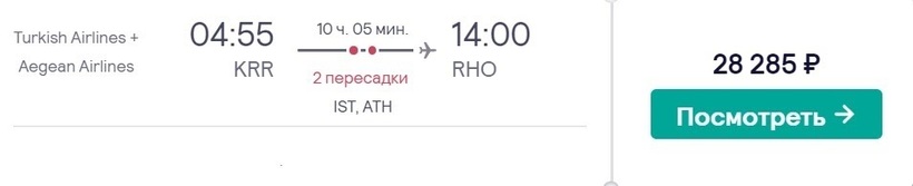 На популярный среди российских туристов курорт из Краснодара можно попасть только транзитом, прямые самолеты туда не летают. Чтобы добраться до этого греческого острова нужно сделать минимум две пересадки. Например, можете рассмотреть перелет с авиакомпаниями Turkish Airlines и Aegean Airlines. Лайнеры авиакомпаний доставят до места назначения за 10 часов. На стыковки в Стамбуле и Афинах уйдет большая часть времени — 5,5 ч.