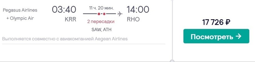 Есть и более дешевый вариант. По времени авиапутешествие продлится немного дольше — 11,5 ч. Авиаперевозчики: Pegasus Airlines и Aegean Airlines (билеты можно купить через Olympic Air). Стоимость перелета только туда — от 17700 рублей (за месяц и более).