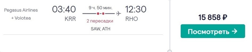 Потратив на билеты минимум 15800 рублей, до Родоса можно добраться за 10 часов. Полетите с авиаоператорами Pegasus Airlines и Volotea. Пересадки в Стамбуле и Афинах продлятся около 5 ч.
