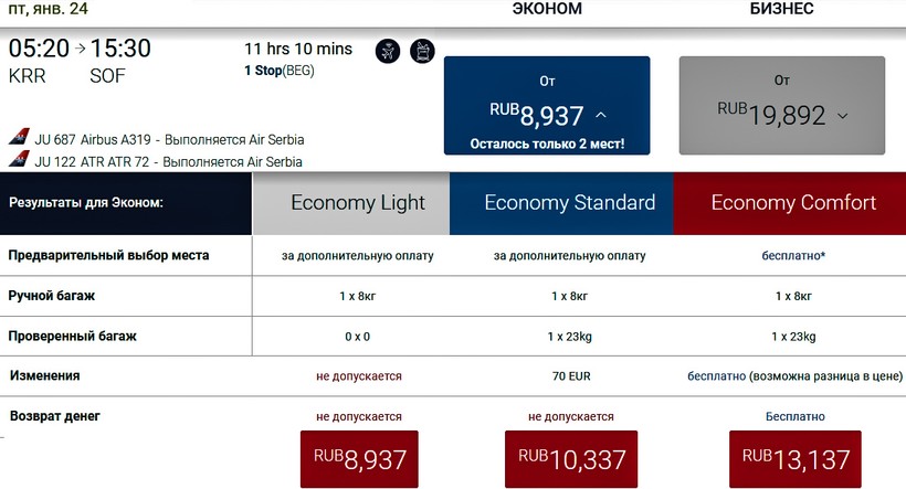 Если первостепенную роль играет скорость перелета, я предпочитаю путешествовать по маршруту на крыльях «Турецких авиалиний», с которыми преодолеть расстояние между городами можно за минимальные 5 часов. Но когда продолжительность полета не очень важна, стараюсь летать с Air Serbia — у оператора на билетах только туда можно сэкономить 7500 ₽ и 9000 ₽ (по сравнению с Turkish Airlines и «Аэрофлотом» соответственно). Самый дешевый бизнес-класс также у сербской компании (напомню, от 20000 ₽). Но любителям путешествий в максимальном комфорте рекомендую все же отдать предпочтение «Турецким авиалиниям», которые предлагают оптимальный вариант полета по времени в пути и стоимости (бизнес-класс дешевле аэрофлотовского на 13000 ₽).