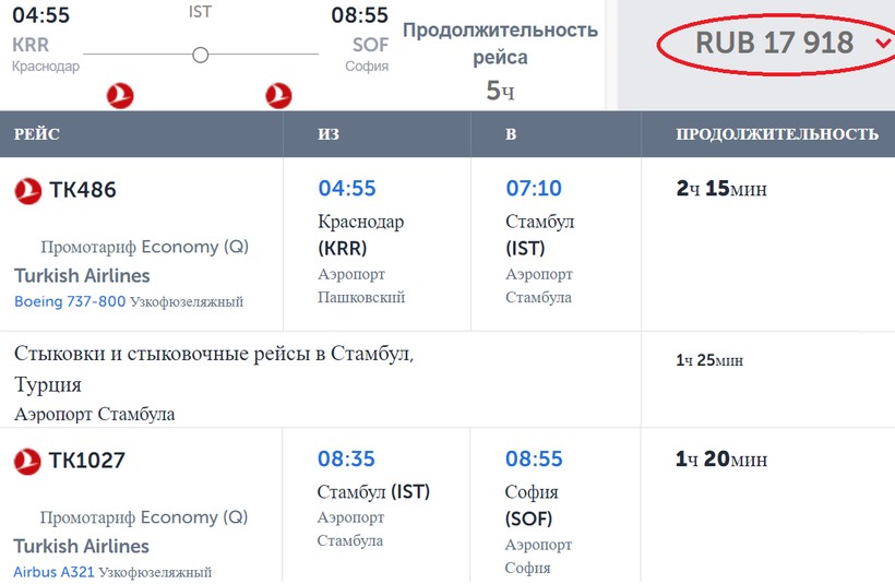 Билеты с багажом у Turkish Airlines дороже, чем у Air Serbia, но дешевле, чем у «Аэрофлота». Перелет в одну сторону стоит от 18000 ₽, туда-обратно — от 25000 ₽. Бизнес-класс — от 62000 ₽.
