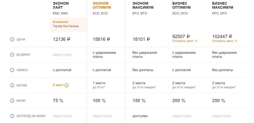 Есть всего три тарифа с разным набором опций. Оптимальнее приобрести «Выгодный», потому что он включает и ручную кладь, и багаж.