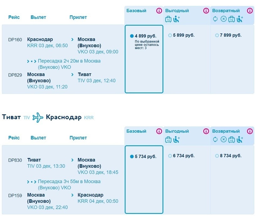 Получается, что S7 — самый дешевый перевозчик, а между остальными особой разницы нет. Помните, что выгоднее покупать билеты сразу туда и обратно.