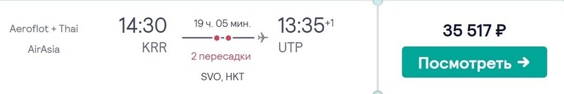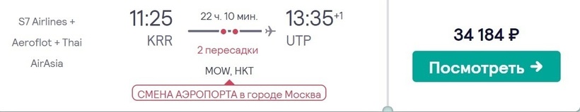 Более быстрый (дорога займет 19 часов) и комфортный вариант — авиапутешествие только с «Аэрофлотом» и Thai AirAsia. Он удобный, потому что в Москве, где будет проходить первая стыковка, менять аэропорт не нужно. Также этот способ авиаперелета предполагает только одну самостоятельную пересадку, а не две, как в предыдущем варианте. Она будет проходить на Пхукете. Вам нужно будет зарегистрироваться на заключительный рейс до Паттайи, который выполняет тайский лоукостер, и пройти другие предполетные процедуры. Всего на стыковки потратите 6 часов (2 ч. — в Москве и 4 — на Пхукете). Стоимость билетов за месяц и более до вылета стабильная — от 35500 рублей.