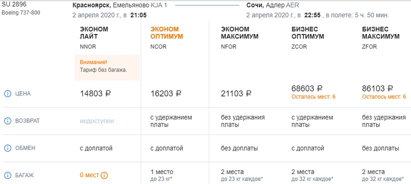 | Россия (FV 6875) Boeing 737-800 | 18:20 Красноярск (KJA) | 6 ч. 10 мин | 20:30 Сочи (AER) | ежедневно с 26.10 по 25.03 |
