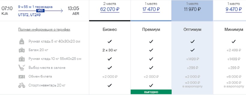 Я для полетов с авиакомпанией также предпочитаю тариф с багажом («Оптимум»), и хочу отметить, что авиабилеты у «Аэрофлота» довольно дорогие: только туда стоят приблизительно от 16500 ₽, в обе стороны — от 25000 ₽. Бизнес-класс — от 69000 ₽.