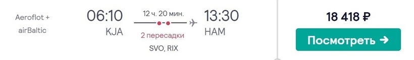 Этот вариант можно рассматривать как более дешевый способ попасть в Гамбург, но не более комфортный, потому что летать с двумя пересадками менее удобно, чем с одной. К примеру, можете рассмотреть авиапутешествие с авиакомпаниями «Аэрофлот», airBaltic. Время в пути — 12,5 ч. На стыковки в Москве и Риге в общей сложности потратите около 3,5 ч. Оба авиаузла в городах пересадок обладают всем необходимым, чтобы комфортно провести здесь время в ожидании следующего рейса. Стоимость авиабилета за месяц и более составляет минимум 18400 рублей. Вариант транзитного перелета доступен ежедневно.