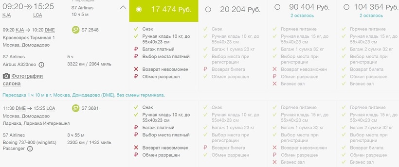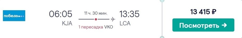 Портовый город на южном побережье Кипра, Ларнаку и Красноярск не связывает прямое авиасообщение. Чтобы попасть сюда, нужно совершить транзитное авиапутешествие. Авиакомпания S7 доставит до места назначения за 10 часов. На стыковку в московском аэропорту Домодедово из этого времени уйдет немногим более 1 часа. За пару месяцев до поездки билет можно купить за 17400 рублей.