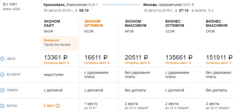 Аэрофлот (SU 1483) Airbus A320 | 11:10 Красноярск (KJA) | 5 ч. 00 мин | 12:10 Москва (SVO) | 1, 14 сентября |