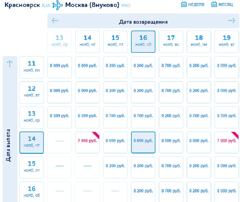 Билеты «туда-обратно» в октябре обойдутся вам всего в 11 455 рублей, а в августе придется заплатить за них не менее 27 315 рублей. В среднем же, долететь до Москвы и вернуться в Красноярск можно за 20 721 рубль.
