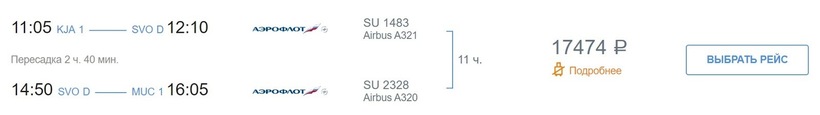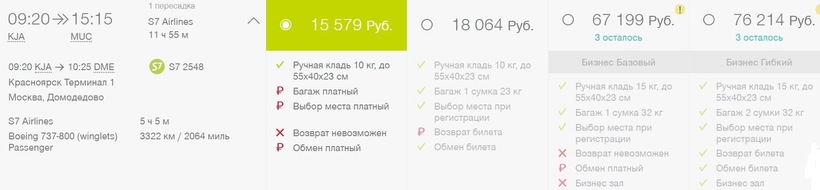 Если путешествую с этой а/к, то предпочитаю оформлять билеты в экономкласс по тарифу «Гибкий». Он позволяет брать с собой не только ручную кладь (до 10 кг), но и багаж (до 23 кг). Если хотите немного сэкономить и летите на непродолжительный срок (без громоздких сумок), то берите «Базовый» (также эконом). Он самый дешевый, но учтите — авиабилет включает только ручную кладь и он невозвратный. Еще из Красноярска в Мюнхен можно попасть с компанией «Аэрофлот». У а/к также есть вполне удобный одиннадцатичасовой вариант перелета со стыковкой в Москве (2,5 ч., аэропорт Шереметьево).