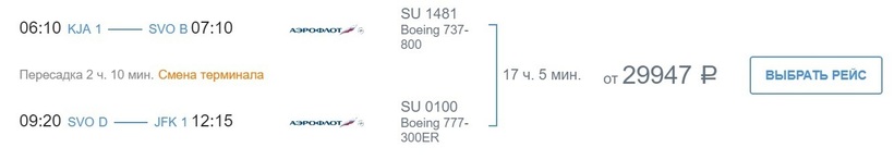 Чтобы избежать смены авиагавани в Москве, советую лететь только самолетами «Аэрофлота». Это не только более удобный, но также и быстрый вариант. Дорога до Нью-Йорка займет 17 часов. Из этого времени на пересадку в Шереметьево уйдет 2 часа. Заново регистрироваться на рейс или забирать багаж не нужно, но другие предполетные процедуры (таможня, паспортный контроль) пройти придется. Если вас интересуют авиабилеты по стоимости 29900 рублей, то их можно купить за месяц до авиапутешествия.
