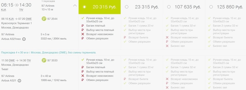 Также транзитный перелет в Тиват предлагает авиакомпания S7. Перевозчик доставит до места назначения за 13,5 ч. На стыковку в столичном аэропорту Домодедово из этого времени отводится 4,5 часа. Смена терминала не требуется.