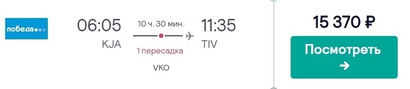 Вариант дешевый и вполне удобный. Перевозчик — лоукостер «Победа». Длительность перелета по маршруту Красноярск — Москва — Тиват вместе со стыковкой во Внуково составляет 10,5 ч. Это один из максимально быстрых способов добраться до конечного пункта. Стыковка в столице займет 2 часа. Именно лоукостер сохраняет одни из самых низких цен на транзитные перелеты из Красноярска в Тиват, поэтому я и выбрала перелет с этой бюджетной компанией. Стоимость билетов в одну сторону — 15300 рублей (за три месяца).