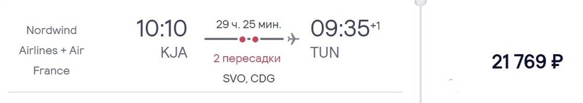 В столицу одноименного государства Тунис из Красноярска можно попасть только с пересадками, прямое авиасообщение между городами не налажено. Потратив на дорогу сутки и 6 часов, до места назначения доберетесь, заплатив за билеты минимум 21800 рублей. Цена актуальна за 1,5 месяца и более до вылета. Авиаперевозчики: Nordwind Airlines и Air France. Первая стыковка будет проходить в московском аэропорту Шереметьево и займет 5 часов. Вторая пересадка — в Париже (аэропорт Шарль-де-Голль). Она более длительная — 12,5 ч.